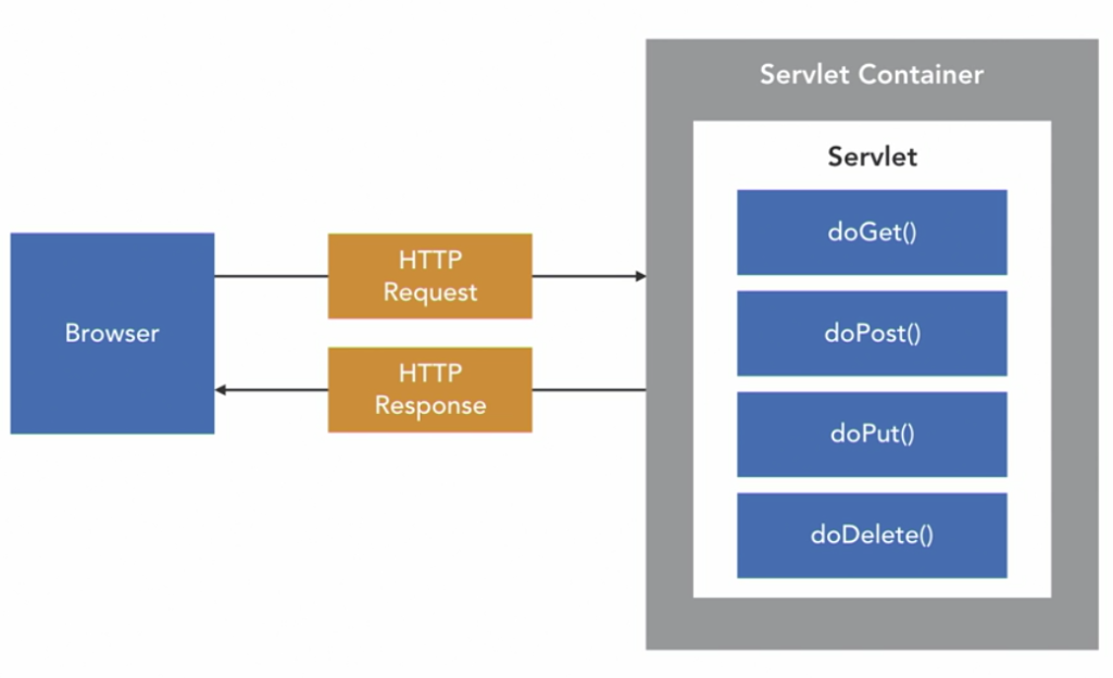 Once a servlet is initialized, it is available to process HTTP requests sent from a web browser using a servlet interface method that corresponds to the HTTP method of the request. Dynamic content is then generated in a response that is sent back to the browser. The servlet manages functionality required to interact with a database or generate dynamic HTML content for example.