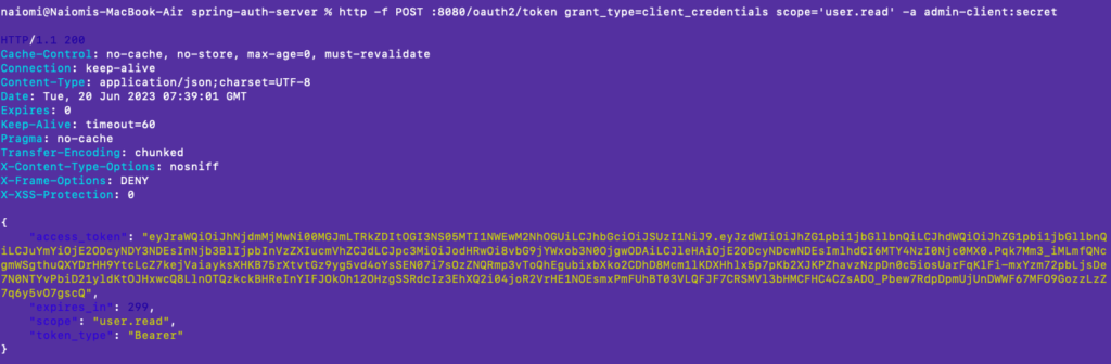 http -f POST :8080/oauth2/token grant_type=client_credentials scope='user.read' -a admin-client:secret